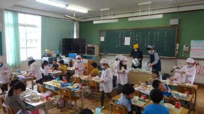 今日はパンの日でした。給食当番も、先生に教えてもらいながら、一生懸命に頑張っています。