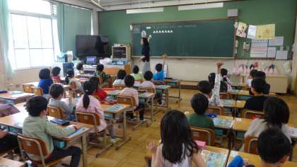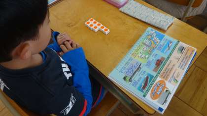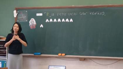 今日は「8はいくつといくつになるか」考えました。おにぎりの絵が黒板に貼られて,楽しく考えていきます。手元には数図ブロックを8個並べ,実際に操作しながら考えていきます。