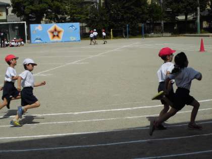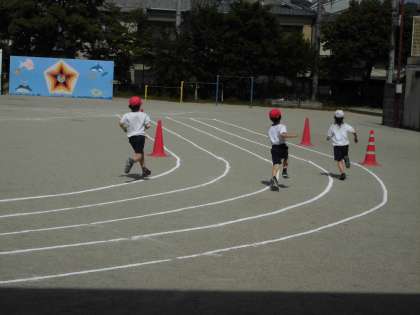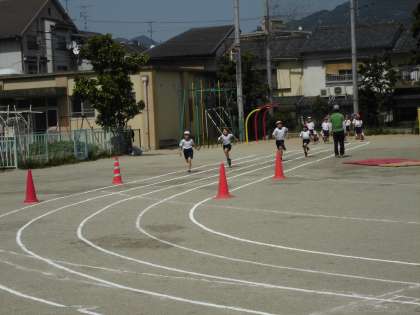 初夏を思わせるような好天のもと,運動会の80メートル走の練習をしました。子ども達は力いっぱい走りました。
