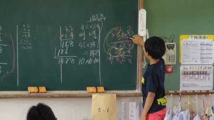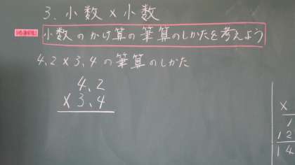 小数のかけ算の筆算の仕方を考えました。これまで学習してきたことをもとにして,自分なりに考えます。そして,自分の考えを発表し合い交流します。学習を通して理解をみんなで深めていっています。