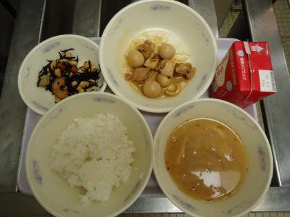 今日はよい天気で暑くなりました。1〜3年生が遠足だったので,4〜6年生だけの給食となりました。今日の献立は,「ごはん・牛乳・鶏肉のさっぱり煮・五目ひじき・いものこ汁」でした。鶏肉のさっぱり煮は,しょうが・にんにくを入れた甘酢のたれで鶏肉とうずら卵を煮ました。ごはんもすすむ味になりました。五目ひじきは,五目煮豆とひじき豆を合わせたような感じでしたが,カルシウムと鉄分たっぷりの栄養価の高い一品でした。