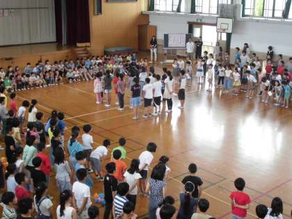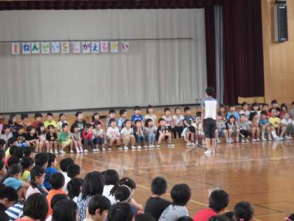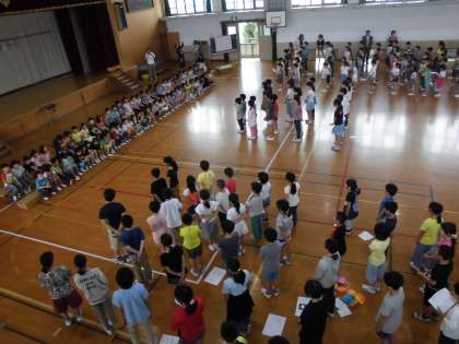 1年生の入場が終わると,代表の児童が「はじめの言葉」を言いました。つづいて,全校コールと歌のプレゼントをしました。