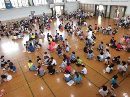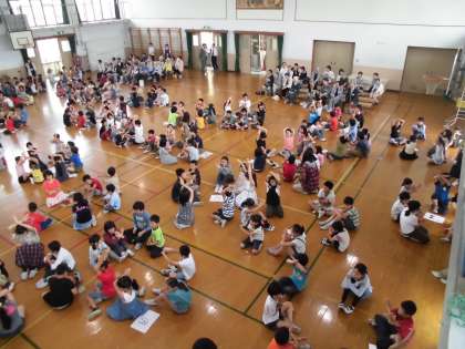 地域のお年寄りの方も体育館後方にお座り頂き,1年生を迎える会をご覧いただきました。