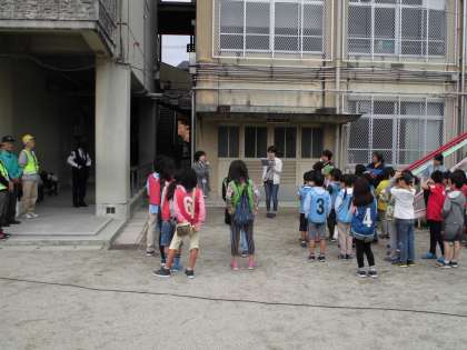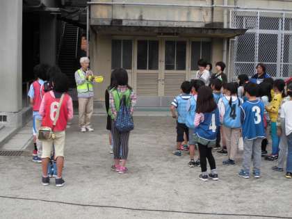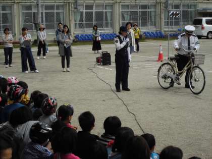 前日の天候が良くなかったので,実施が危ぶまれましたが,当日は天候が回復し今年も自転車教室が実施されました。学校長,PTA副会長,地域の方の挨拶が行われ自転車教室が始まりました。下鴨警察署の方から安全に自転車に乗る方法を教えて頂きました。