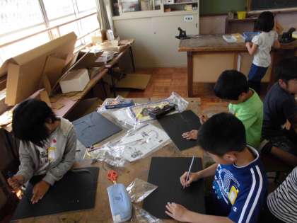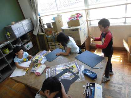 段ボールカッターを使って作品作りをしました。カッターを上手に使って穴をあけている子どもがいました。