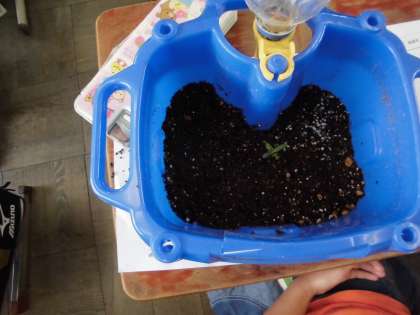 植物の観察をしました。先日種まきをしたマリーゴールドや大豆等が発芽したのでその様子を観察カードに記入しました。