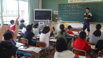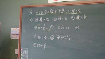 分数の学習をしている6年生。今日は,かける数が1より大きい場合と小さい場合で,積にどんな違いがあるのか,みんなで考えました。5年生の小数の学習の時を思い出しながら,考えを進めていきまいした。