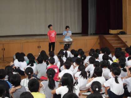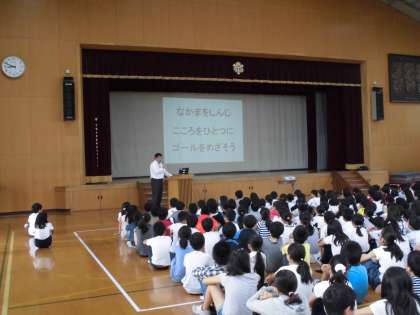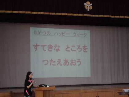 今日の朝会ではまず,校長先生が「下鴨小学校の子ども達のいいところみつけ」と「運動会のスローガン」について話をしました。次に担当の先生が絵本の読み聞かせを通して,6月の目標について話をしました。最後に図書委員会の子ども達が読書週間の取組について話をしました。