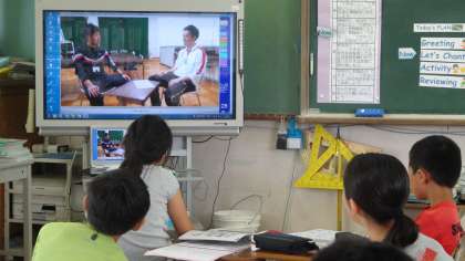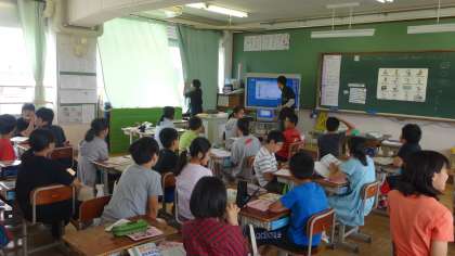 外国語活動の授業の様子です。友だちとのやり取りをする前に,先生たちのデモンストレーションを見てイメージをつかみます。身近な先生のやりとりを,少し楽しそうにみんな見てイメージをつかんでいました。