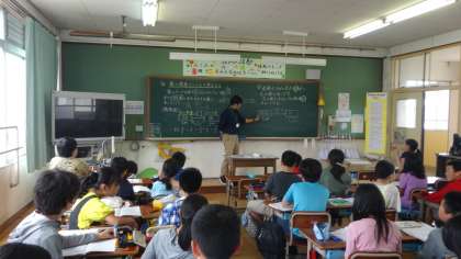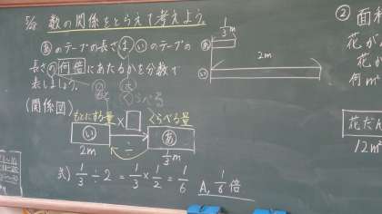 算数の時間の様子です。割合の問題を関係図を使って考えます。考えたことは,友だちに説明し,理解を深めていっています。