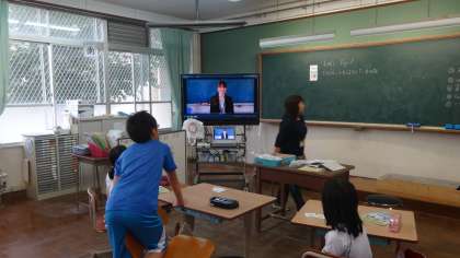 外国語活動の時間の様子です。ALTの先生が登場してのデモンストレーションを見ながら,楽しそうにコミュニケーションを図っていました。