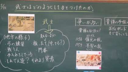 社会の歴史学習も,時代がどんどん進んで武士の時代へ。これまでの貴族の暮らしぶりと比較しながら,武士の生活の様子を考えました。