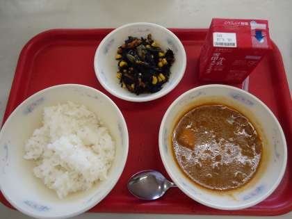 今日の献立は「ごはん・牛乳・カレー・ひじきのソテー」でした。1年生も「ちょっとからいけどおいしかった。」「おかわりしたよ。」と言ってくれました。給食室で手作りのルウといろいろな調味料を入れて,ことこと煮込んだカレーはいつも大人気のメニューです。「ひじきのソテー」もコーン・にんじん・三度豆が入って彩りがよく,「コーンといっしょに食べたら甘かったよ。」と感想を届けてくれました。ごはんもしっかり食べられました。