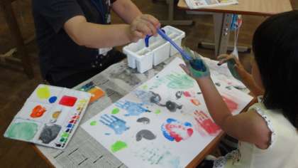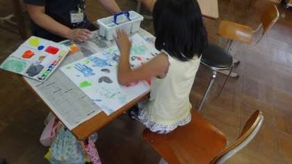 いろいろな色を作って,手のひらや指を使って,画用紙に色を付けていきました。時間が進むにつれ,どんどんカラフルになっていきます。とても楽しそうに活動していました。