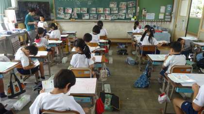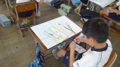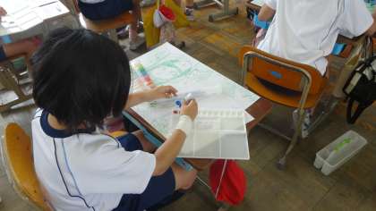 青い祭りの思い出を絵に描いていますが,今日から絵の具で色を塗っていきます。下絵で描いた線を大事にしながら,ていねいに塗っていきます。