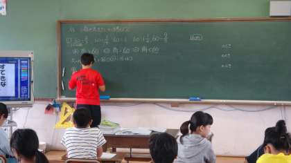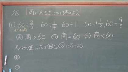 分数のわり算の学習です,わる数が1より大きいか小さいかによって,商がどのようになるか調べていきました。