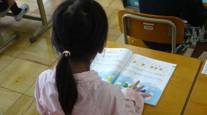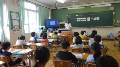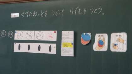 先生の伴奏に合わせて楽しそうに歌う1年生。ピアノを習っている子は,先生と一緒に机をピアノの代わりにして,同じように弾いていました。今日は,カスタネットを使って,リズム打ちにも挑戦しました。