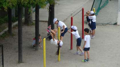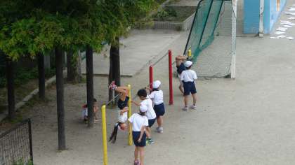 体育では鉄棒の学習に取り組んでいます。苦手にしている人もいますが,「逆上がりができた!」と嬉しそうな報告の声も。友だちと励まし合いながら,みんな頑張っています。