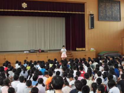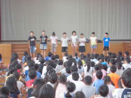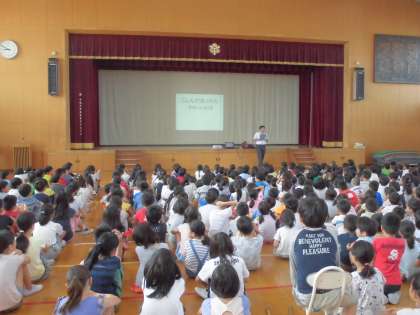 体育館で朝会を行いました。まず,校長先生が下鴨小学校の「いいところ見つけ」みんなに伝えました。次に6月18日に起こった大阪北部地震の話から地震が起こった時にどのように行動しなければならないかを話しました。そのあとに児童会の子ども達が7月の目標について紹介しました。最後に図書委員会から先週の読書週間についての連絡がありました。