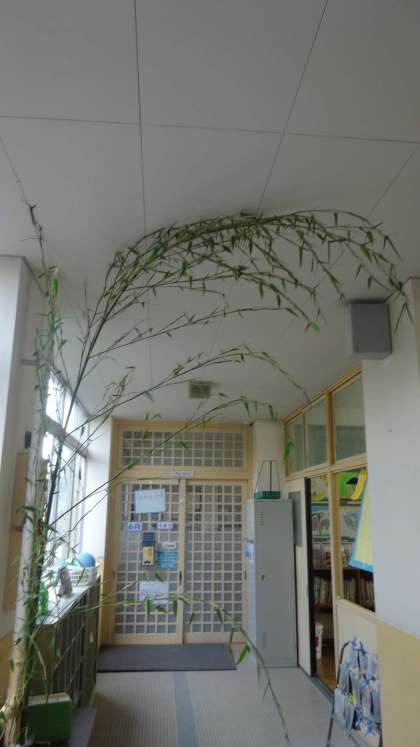 毎年,下鴨神社から笹をいただいていますが,今年も立派な笹をいただき,早速廊下に飾りました。笹かざりをこれからみんなで飾りつけしていきます。短冊に願い事を書いて,もうつるしている人もいます。