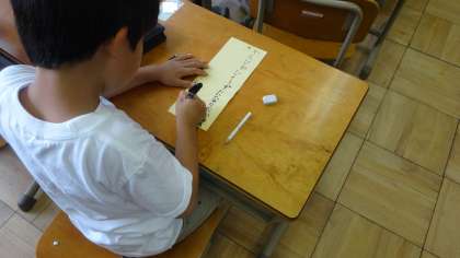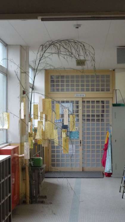 七夕の短冊に願いを書き,笹につるしました。平仮名を学習してきた1年生。しっかりとした字で願い事を書いていました。