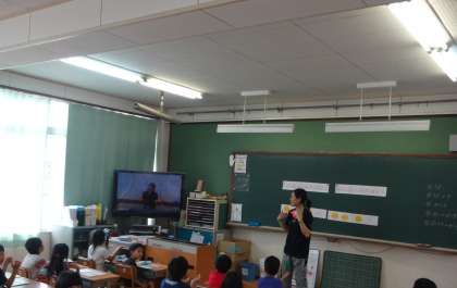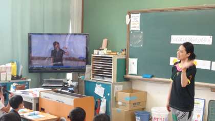 本校では1年生でも英語活動に取り組んでいます。今日はALTの先生のあいさつする様子を見ながら,みんなで一緒にやってみました。
