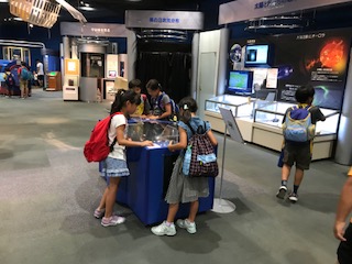 科学館では、グループに分かれて見学しています。