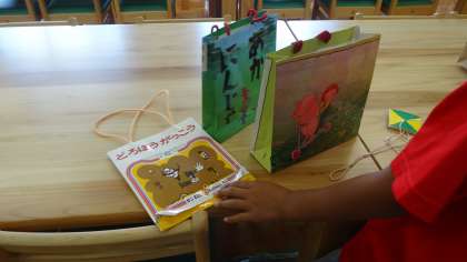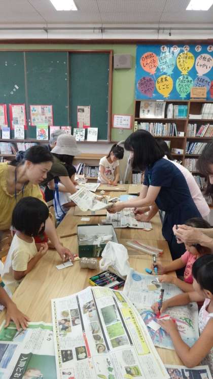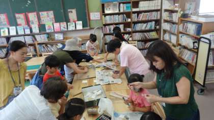 読み聞かせの中で出てきたびゅんびゅんゴマの作成もして楽しみました。いつもいろいろなイベントを考えてくださっています。次回,8月22日の開館日には,ブックカバーを使ったエコバックの作成を企画しているそうです。ぜひ,参加してみてください。