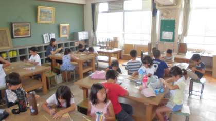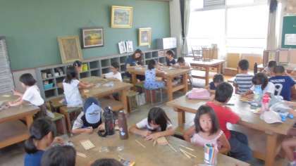 竹とんぼ作りをしました。子ども達は竹とんぼにマジックできれいな模様を描きました。出来上がった子ども達は体育館で竹とんぼを飛ばして遊びました。