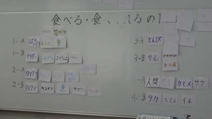 「生物どうしの関わり」の学習です。動物の「食う・食われる」関係についてみんなで考えました。
