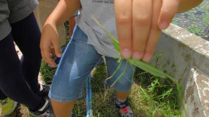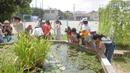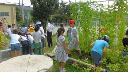 学校園で生き物を探しました。バッタを見つけた子ども達がいました。