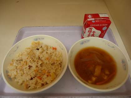 きょうの献立は「五目ごはん・牛乳・豚汁」でした。京都市で災害用に備蓄しているアルファ化米を使用しました。アルファ化米は,米飯を急速に乾燥して水分をぬいたもので,非常時には水を加えるだけで食べられますが,給食ではチキンささみ・たけのこ缶・乾燥にんじん・干しいたけなどの具を加えて加熱し炊き込みごはんにしました。9月1日は防災の日です。ご家庭の方でも食料品の備蓄など考えてみましょう。