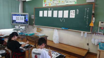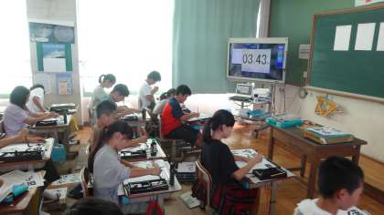 習字の時間,6年生は担任の先生が入れ替わります。1組の担任が2組の教室で,2組の担任が1組の教室で,それぞれ学習をすすめます。今日は『思いやり』を書きました。