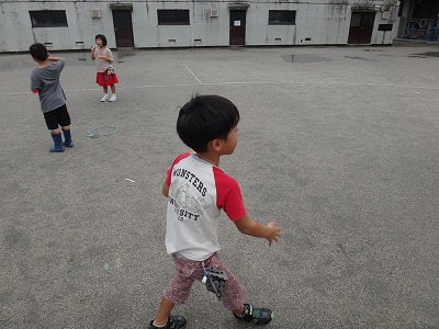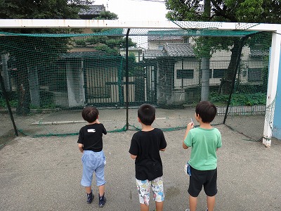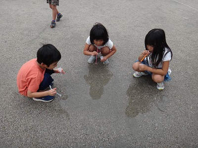 「きせつと あそぼう」の学習です。夏も終わりを迎え始めていますが、夏遊び恒例のシャボン玉をしました。シャボン玉を追いかける子、水たまりに向かってシャボン玉を作る子、サッカーゴールに向かってシャボン玉でシュートしたいとゴールめがけてシャボン玉を作る子…。子どもたちの明るい声が運動場に広がっていました。