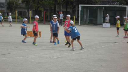 エンドボールの学習をしています。グループで作戦をたて,相手のいない所へボールを動かして攻めていました。