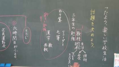 国語では「つたえよう,楽しい学校生活」の学習をしている3年生。今日はどんな話題を伝えていったらいいか,みんなで考えました。