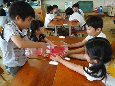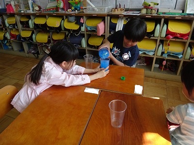 「かさくらべ」の学習です。ペットボトルに入った水の量を3つの方法で比べてみました。容器に入れた水の高さやコップの数を比べて答えを導き出しました。