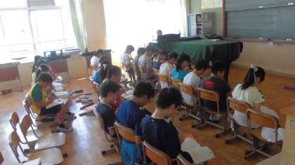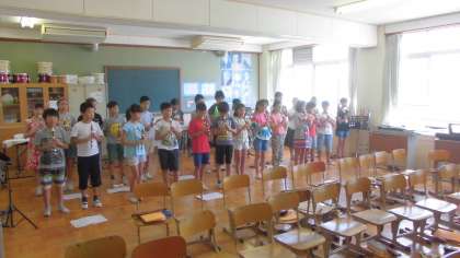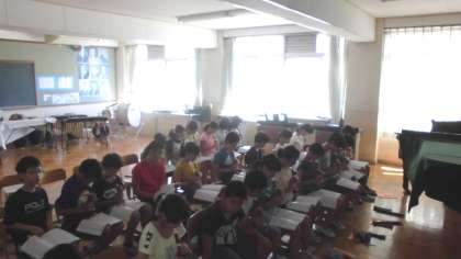 スクールサポータ—の先生と一緒に学習しています。リコーダーでキリマンジャロ,カノンの練習をしました。美しいリコーダーの音色が音楽室に響きました。