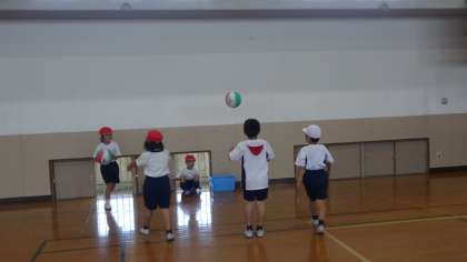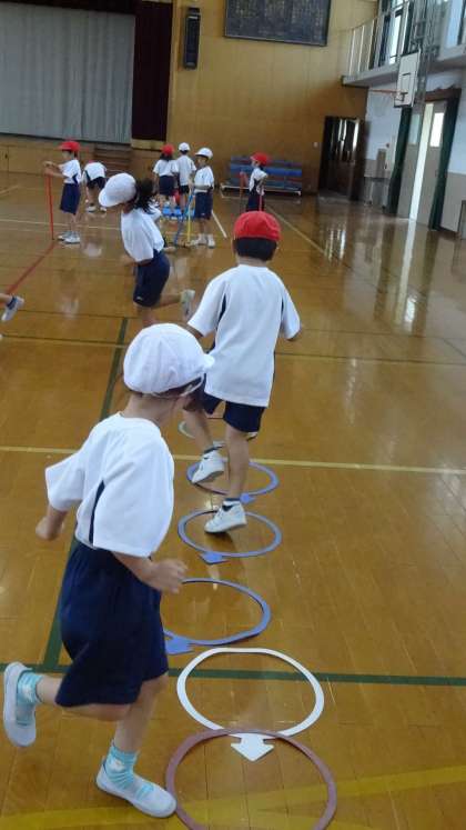 まねっこあそびの学習です。いろいろな道具を使って,楽しみます。みんな目いっぱい体を動かして楽しんでいました。