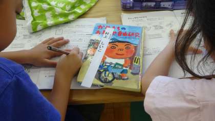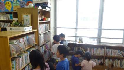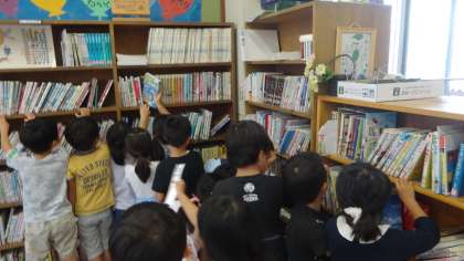 学校司書の先生と図書室の使い方を学習しました。作者名を見ながら,その作者の作品を見つけてきます。本棚にある「あ」「か」「さ」「た」「な」・・・の表示を頼りに,友だちと協力して探していました。