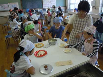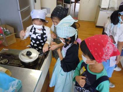 「ぐんぐんそだて」の学習です。5月に植えたとうもろこしを収穫し,ポップコーンを作りました。火を点けてしばらく待つとポンポンととうもろこしの弾ける音がし,いいにおいがしてきました。おいしく戴いた後には,後片付けもしっかりとしました。
