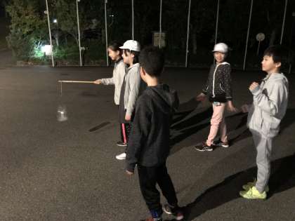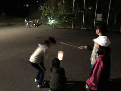 ナイトハイクの様子です。夜の山の中は真っ暗。その真っ暗の中を,ペットボトルランタン一つ持って,ハイクです。