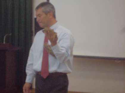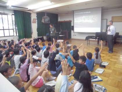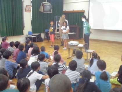 京都水族館から3名の方に来ていただき,環境学習の出前授業です。京都水族館といえば,オオサンショウウオ。オオサンショウウオはぬいぐるみでしたが,ほかにも生き物を持ってきてくれて,みんな興味津々でした。