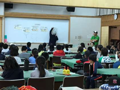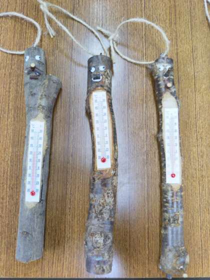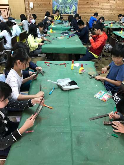 お昼からはクラフト活動。小枝温度計を作ります。まずは手順を聞いてから,製作開始です。