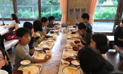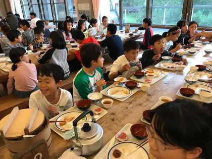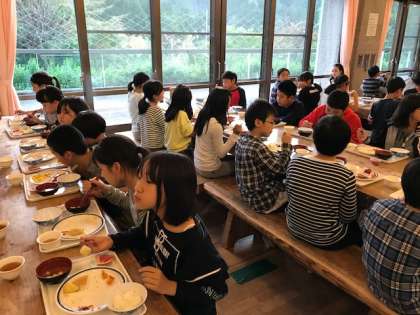 2日目の活動も終え,夕食は再び食堂で。食堂でのルールにも慣れ,みんなでおいしくいただいています。