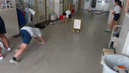 一生懸命に廊下の拭き掃除をする6年生。下鴨小学校の良き姿,下級生にも伝わっていることだと思います。