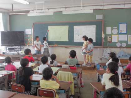 子ども達は環境問題について調べた事を他の学年に発表します。今日は発表の練習をしました。指示棒を使ってわかりやすく説明していました。