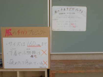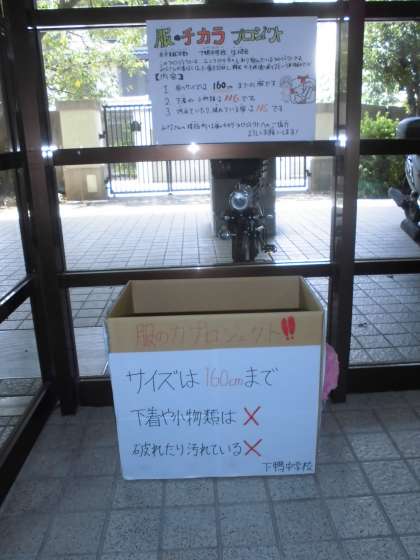 下鴨中学校生徒会の取組に協力して,下鴨小学校でも服のリサイクルを行っています。玄関ホールと渡り廊下に不要になった服を入れる箱が設置されています。服のサイズは160まで。小物や下着は回収できません。また,汚れたり敗れていたりするものも回収できません。ご家庭で使わなくなった服があればご協力をお願いします。