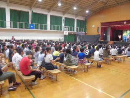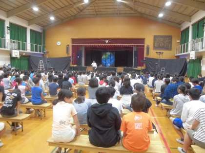 体育館に全校児童が集まり,ミュージカルの鑑賞をしました。劇団「笑う猫」の方々にお越し頂きました。参加型ミュージカルで開演前に児童に手拍子,足拍子のやり方を教えてもらいました。