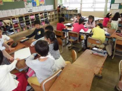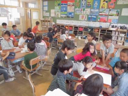 「だいすき,わたしたちのまち」の単元の学習をしています。今まで行った校区探検で調べたことを発表するために,それぞれのグループでポスターの内容を相談しました。